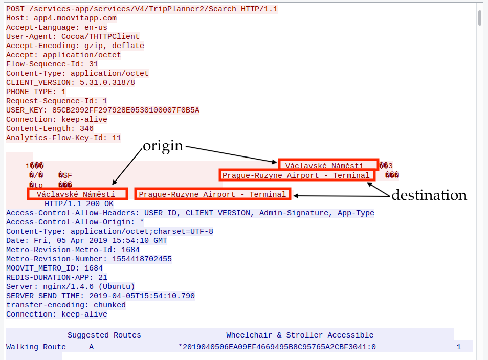 When the user confirms the starting point and the destination. The application sends a request revealing these two points. For example when the user wants to navigate from “Václavské Náměstí” to the Prague Airport, the request looks as follows: